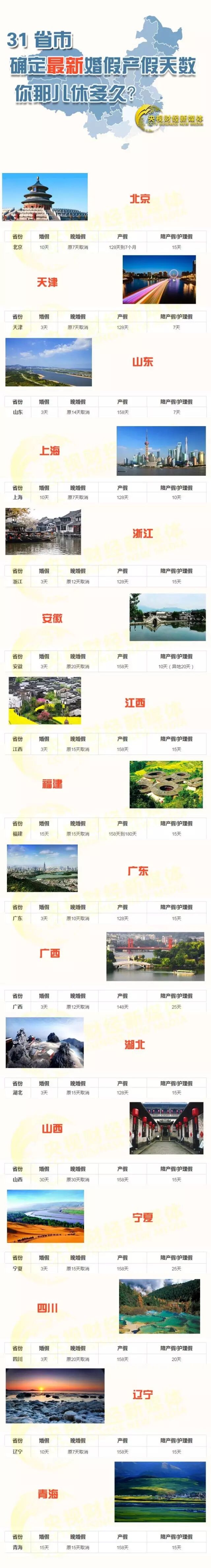 据了解,各地对原有的婚假、产假以及陪产假(即男士的护理假)均做出了相关的修改,从目前出台的规定来看,大多数省份的婚假都是在取消晚婚晚育、规定延长生育假的大原则之下,绝大多数省份的婚假天数是与国家法律规定保持一致的。