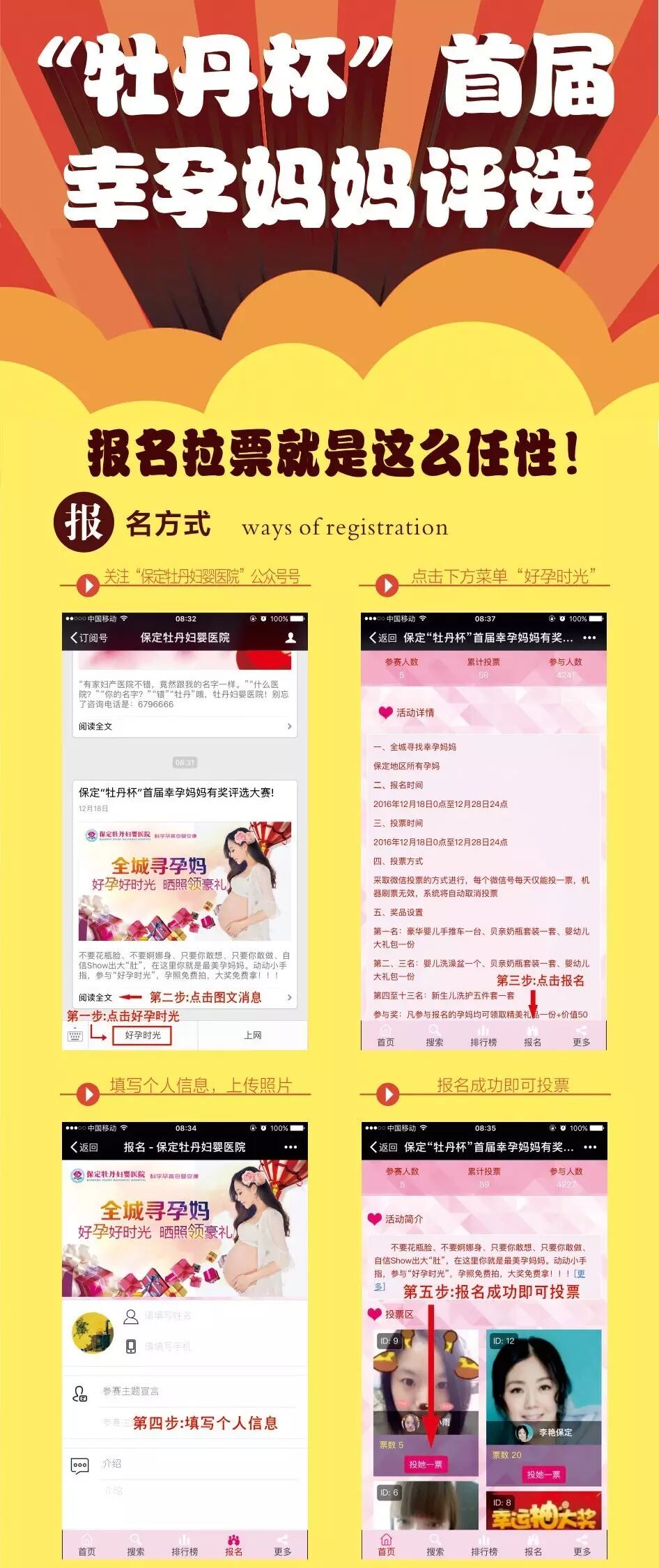 为自己拉票的孕妈,一定要让好友关注“保定牡丹妇婴医院”公众号,关注后点击底部“好孕时光”进入活动页面,找到自己的编号,点击“投她一票”,才能有效投票噢。
