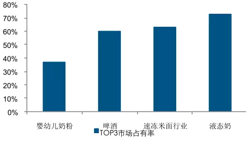 目前我国婴幼儿奶粉行业品牌众多,集中度不高,CR3 不足 40%,国外一般婴幼儿奶粉主流品牌很少,并且集中度相对较高,达能在新西兰的市场占有率高达 57%。随着注册制的推出,我国众多的小品牌将会退出,行业将会面临“大洗牌”,龙头企业在行业整合中提升市场份额,参考国外主流奶粉品牌一般不超过 5 个,未来我国奶粉品牌竞争格局将会是几个国际大牌和几个国内品牌。