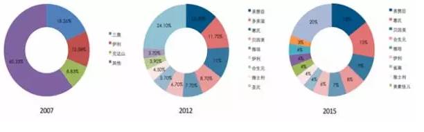2008 年是我国婴幼儿奶粉的分水岭,2007 年,国产品牌占据 60%的市场份额,其中伊利、圣元等品牌稳稳占据了中高端市场,三鹿、完达山等品牌则固守中低端市场,而国外品牌主要定位于高端市场。2015 年我国婴幼儿奶粉市场,市场占比最大的前两大品牌都是外资品牌,并且从整体看,外资品牌占比达到 50%左右。随着当时的国产奶粉龙头三鹿的破产,消费者对于国产奶粉的信心大幅下降,进口奶粉品牌大幅替代国产奶粉,进口奶粉品牌占比曾经最高达 60%左右,随着之后奶粉行业逐渐规范,消费者信心逐渐恢复,国产奶粉份额开始逐渐回归,当前进口和国产约各占 50%。2008年之前,我国奶粉品牌 Top3 的市场份额在 40%左右,但 8 年后集中度提升不明显,甚至是在下降的。最大的龙头品牌市场份额仅 15%,几大龙头之间竞争差距不大。
