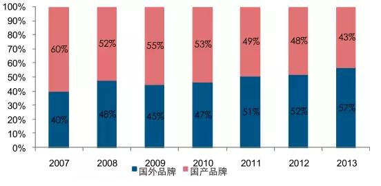 我国婴幼儿奶粉线上销售渠道占比大幅提升至 28% , 并且电商渠道中销售前几名均为国外品牌。2014 年我国婴幼儿奶粉销售渠道中超市、 母婴店、 电商占比分别为 30%、 42%、28%,和 2011 年相比,电商渠道占比提升 13pct,母婴店占比提升 6pct,并且据统计电商渠道销售前几大品牌均为海外品牌,前六大品牌占比超过 60%。, 据推算,2015 年海淘代购进来的奶粉 达到约 150 亿元。而国内奶粉市场规模在800 亿元 左右 ,海淘市场份额在 15%-20% 之间。