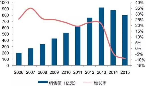 2015 年我国婴幼儿奶粉市场规模约为 800 亿(出厂价口径) ,同比 2014 年继续下滑近9%,2014 年之前行业保持较快增长,增速在 20%以上,市场规模自 2006 年的 200 亿元,增长至 2013 年最高点约 900 亿,增长超过 3 倍,年复合增长率将近 25%。