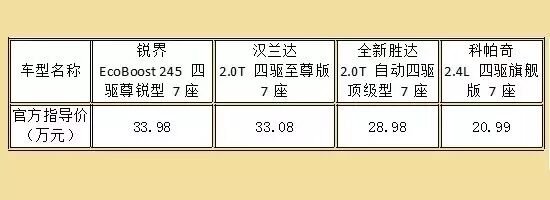 福特锐界、广汽丰田汉兰达、北京现代全新胜达以及上汽通用雪佛兰科帕奇这四个品牌的SUV均有7座车型,它们有着共同的特点,那就是价格适中,车子够大,开出去也较为体面,在目前市场上处于较为主流的地位。为公平起见,小编选择它们各自的2.0T顶配车型(科帕奇为2.4L)来进行分析比较。