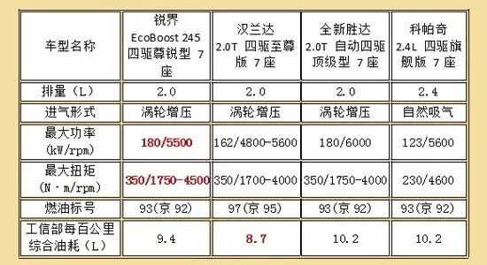 说完外观以及配置,我们来综合考量下这四台7座SUV的发动机数据,2.0T锐界的数值无疑最为突出。就燃油经济性而言,汉兰达车型的官方油耗最为理想,但它对燃油标号要求更高,其它三款则都能吃“粗粮”。