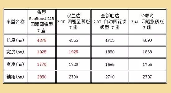 为描述简练,以下文字均采用车型简称。首先,就车身尺寸而言,锐界是这四款车中个头最大的一台。汉兰达车型紧随其后,全新胜达以及科帕奇则稍逊一筹。