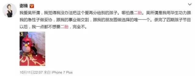 吴京的老婆谢楠之前就发过一条微博,明确表明不生二胎。评论底下也是吵得五花八门的。本鹿很欣赏谢楠,因为对于二胎,她有自己的想法和立场,毕竟每个人都有自己选择的权利。