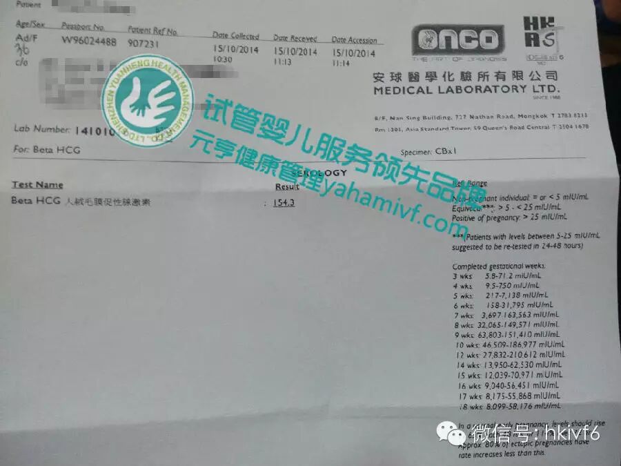 2014年8月28日,江女士到香港进行看诊检查,结果江女士的身体情况符合做试管的要求,医生根据江女士的情况给她安排的试管计划。2014年10月2日,江女士在香港取卵11个,配成5个胚胎,10月5日移植了一个胚胎。2014年10月15日,在我们进行第五届泰国试管婴儿专家看诊会的同时,香港那边传来喜讯:江女士在香港验孕HCG值154.3成功一次性好孕!