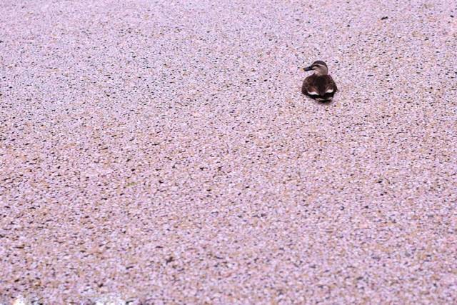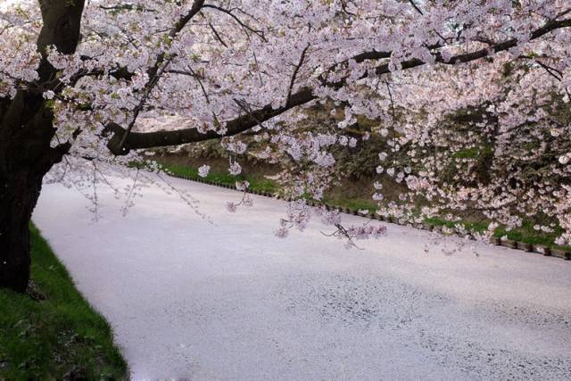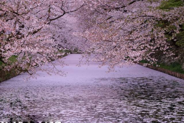 前日,位于日本青森县弘前市的弘前公园内的护城河被飘落的樱花花瓣染成了美丽的粉色,整个河道看上去如梦似幻、美不胜收。(来源:东方IC)