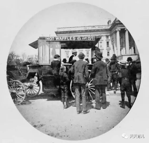 下面是一张摄于1889年的照片,一位小贩正在白宫庭院里卖华夫饼。