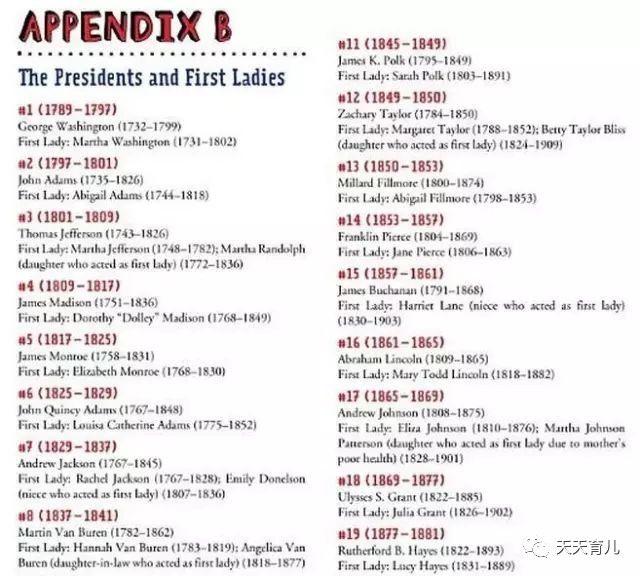 ▲《白宫的孩子们》附录B:美国历代总统和第一夫人。在带孩子读书的过程中,可以时时翻阅附录,知道事情发生的背景是哪个年代。