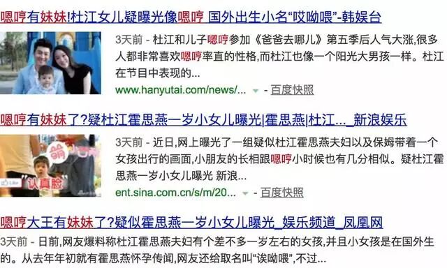 近期,在《爸爸去哪儿》的未播花絮中,嗯哼和杜江说自己想要一个姐姐,杜江笑说“现在生也不是姐姐啦。”嗯哼说“我猜我回去,我妹妹就长大了。”透过这字里行间,网友猜测杜江霍思燕是不是真的有个女儿了呢?