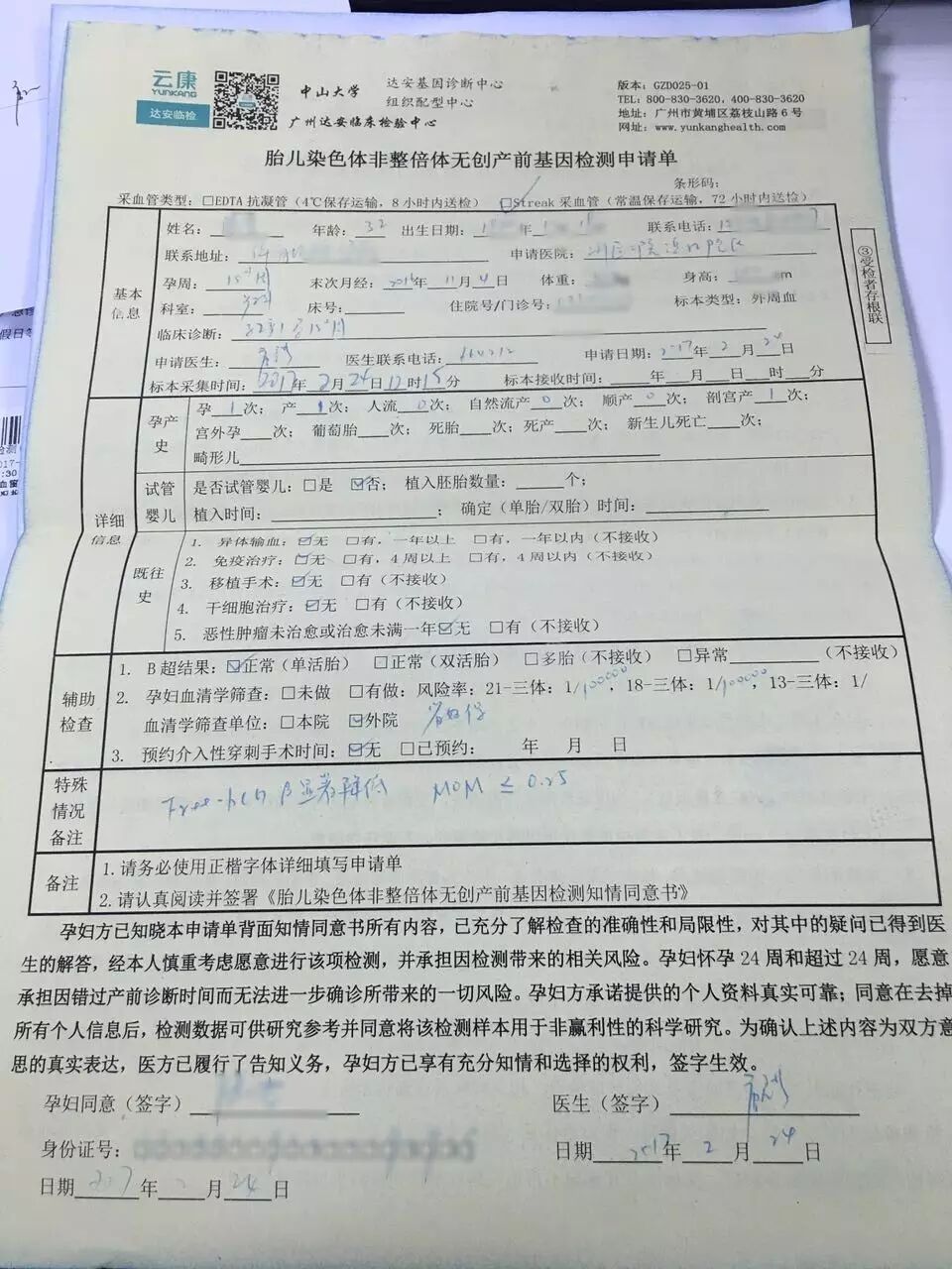 无创很快,加上门诊等待、抽血时间,40分钟搞定:填两张单子,一张是申请单,另一种是保险单,付了钱,抽一管血,两个礼拜拿报告。期间没接到医院电话,就说明检查结果是低风险。没有消息,就是最好的消息,用在这里最合适不过了。