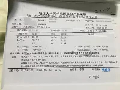 丢妈约的中期唐氏筛查时间是15周+6天,也就是第二次去社区医院检查的日子。在检查的前几天,接到社区医院储菊医生的电话通知——早期唐氏筛查报告出来了,结果并不是那么好。丢妈当时听了,心里一沉。抽了空,去社区医院拿了化验单。