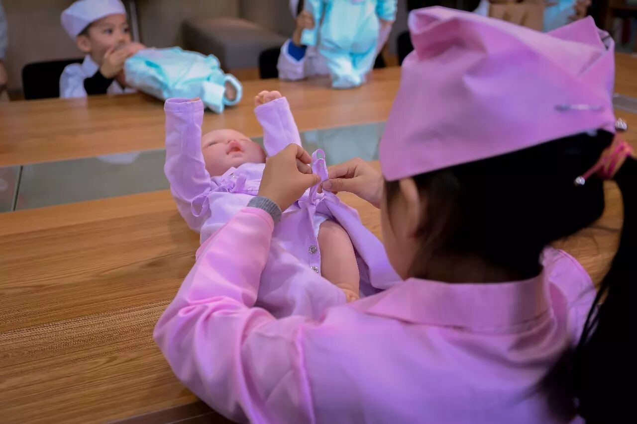 回到原来的大桌子前,此时,桌子前已经出现了小宝宝。让即将成为哥哥姐姐的孩子们提早体验一把小小育儿师的心情,也感怀爸爸妈妈曾经照顾自己的不容易。一个个认真的给小宝宝穿起尿布和衣服。活动中有些女孩儿更是把小宝宝抱在怀里不愿意撒手,竟看出一副温柔的样,看来是对弟弟妹妹期待已久呢。