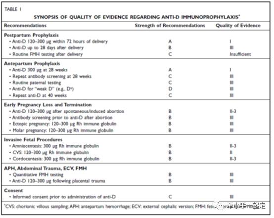 加拿大母婴医学委员会和遗传学委员会 (Maternal-Fetal Medicine Committee and the GeneticsCommittee)发表的《Rh免疫反应的预防》(PREVENTION OF RH ALLOIMMUNIZATION)建议:
