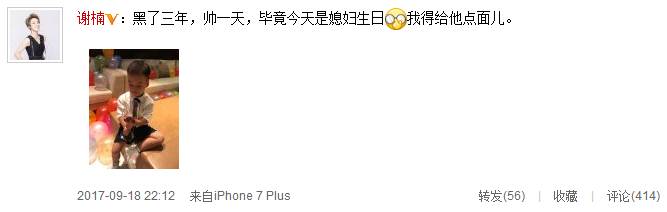 楠通过微博晒无所谓小朋友帅照,并写道:“黑了三年,帅一天,毕竟今天是媳妇生日,我得给他点面儿。”