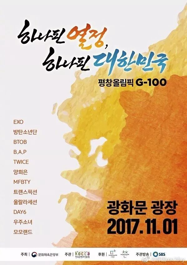 《2018平昌冬奥会G-100》圣火传递祝贺K-POP演唱会将于韩国时间11月1日下午6时在首尔光华门广场通过特设舞台与大众见面,另外此次公演中,EXO-防弹少年团-TWICE-B.A.P-BTOB-NCT127-DAY6-宇宙少女-ULALA SESSION-MOMOLAND,以及MFBTY-杨熙恩-TransFixion等人气&实力歌手们将齐出动,带来精彩表演。另外此次公演将通过SBS进行实时直播,敬请期待。