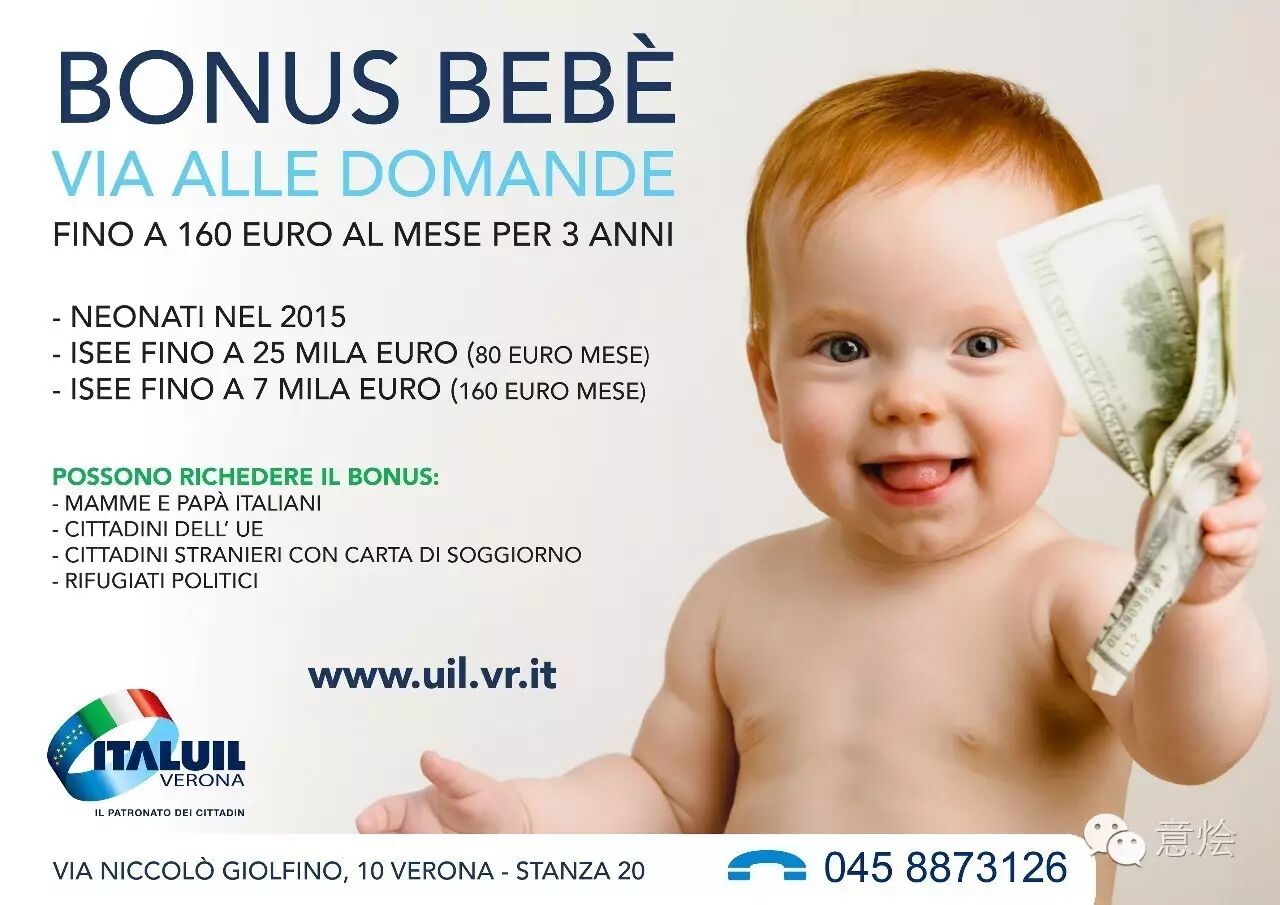 意大利《共和国报》消息,面对意大利目前出生率严重下滑的问题,意大利卫生部部长罗伦辛(Beatrice Lorenzin)建议把鼓励生育的“新生儿补贴”提高一倍,预计将会在新的意大利稳定法中出现。