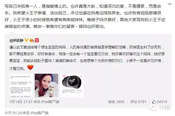 同一天的晚些时候,伊能静再次更新微博晒B超照,并发表长微博,细数怀孕心路历程,感恩“猴子”是上天送给她和秦先生的礼物。