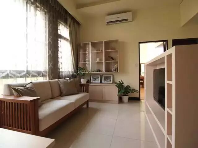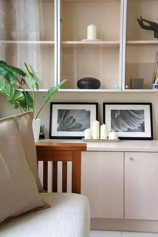 落地窗很大,沙发只有横过来放才不显得突兀。沙发左右两边都做了储物柜,怕落灰都给封上了玻璃,做展示架挺好。