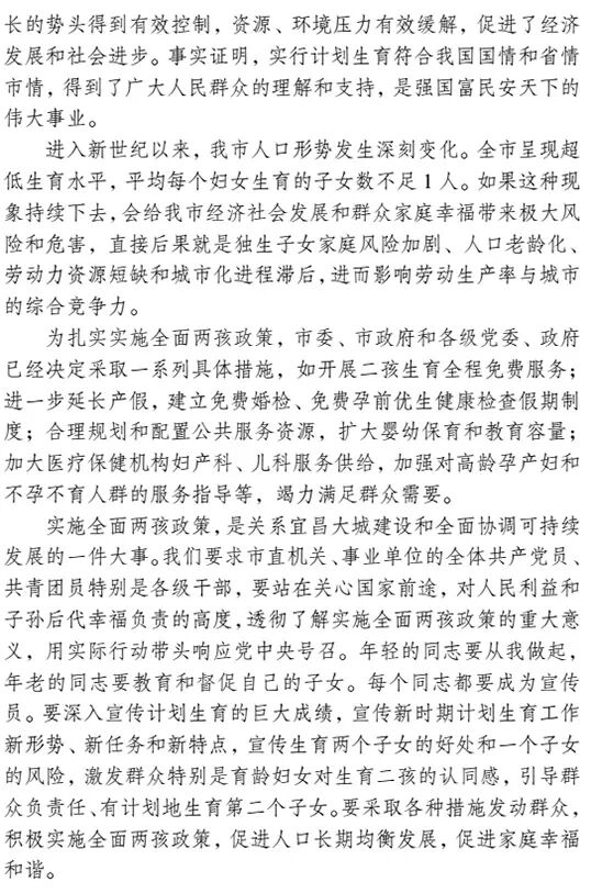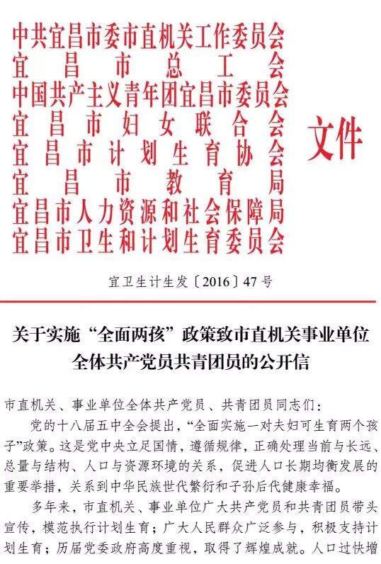 最新消息,据澎湃新闻报道,9月18日,湖北省宜昌市卫计委网站挂出一封《关于实施“全面两孩”政策致市直机关事业单位全体共产党员共青团员的公开信》。