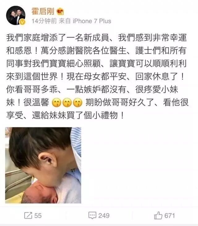 4月24日13:57,霍启刚在生下孩子的那一刻他就急不及待低发文:我们家庭增添了一名新成员、我们感到非常幸运和感恩!万分感谢医院各位医生、护士们和所有同事对我们宝宝细心照顾、让宝宝可以顺顺利利来到这个世界!现在母女都平安,回家休息了!你看哥哥多乖、一点嫉妒都没有、很疼爱小妹妹!很温馨,期盼做哥哥许久了,看他很享受、还给妹妹买了个小礼物!