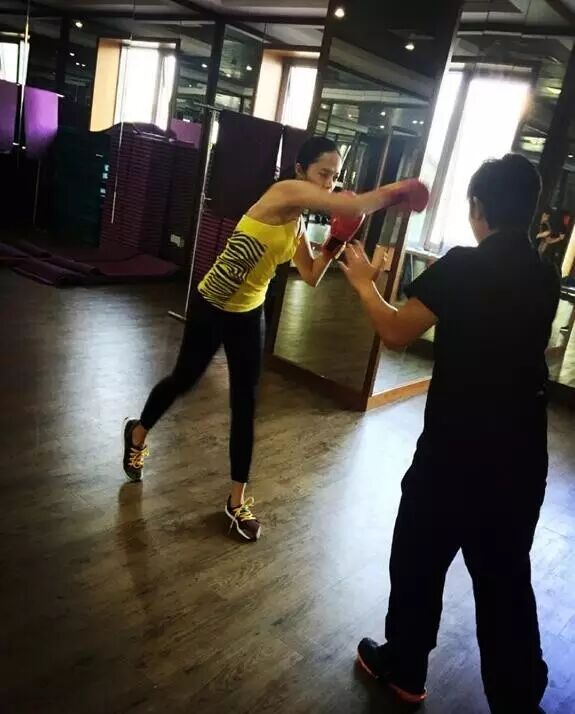 在微博上晒出一组健身照,身穿紧身裤和小背心,手戴健身拳套,在练习拳击。