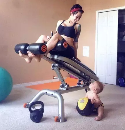 可以边锻炼腿部,边逗宝宝玩。让宝宝面对着麻麻坐着(现在很适合做鬼脸哦),双腿一起提升。这是布鲁克很喜欢的一项运动,简单有效。完成30次后,麻麻可以开始干活了。