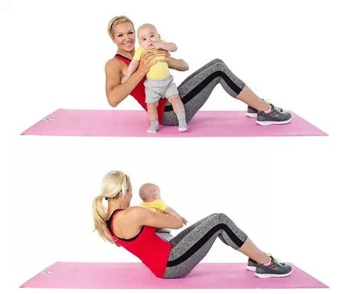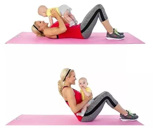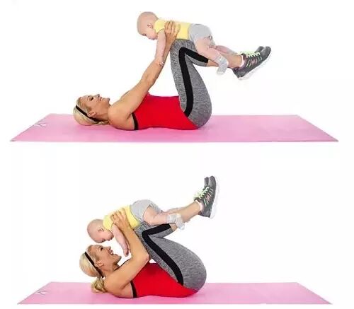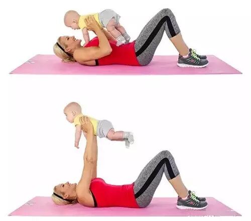 仰卧在地板上(一定要用舒适的垫子),把宝宝放在腿上,用手扶紧宝宝。弯曲麻麻的腿,一直到离开地面即可。做15到20次。休息几秒钟,然后再做1组。