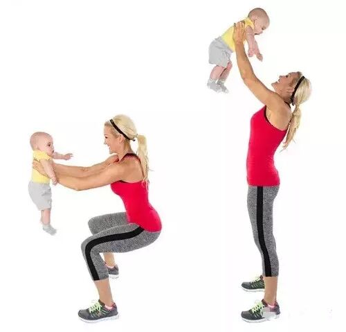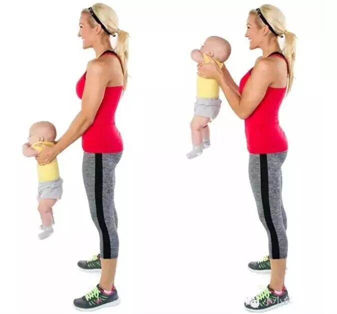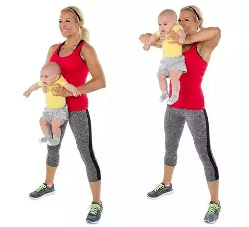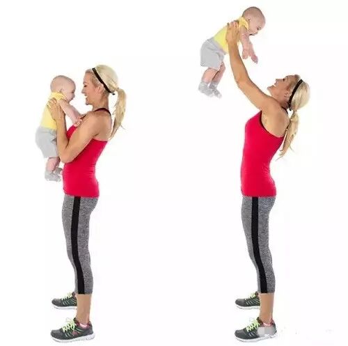 麻麻可能每天都在做这个动作,对它并不陌生!直立,用双手抱紧宝宝,利用肩膀的力量,将宝宝举至半空中,然后收回肩膀。完成3组,每组15个。
