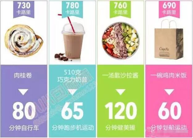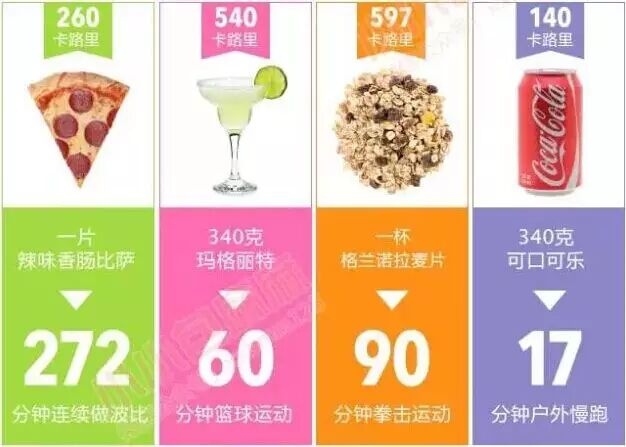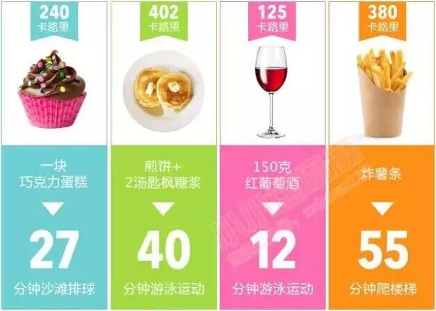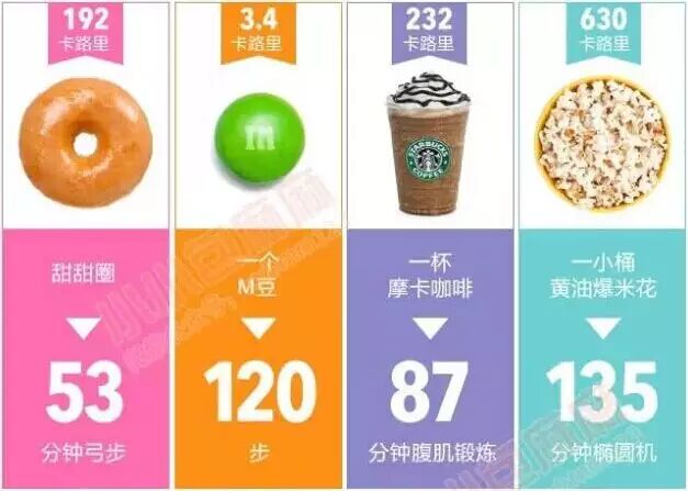 下面这张图建议麻麻每天都看看,这样每次想吃这些东西的时候就知道要用多少运动才能抵消掉,酱紫吃之前就能悬崖勒马了~