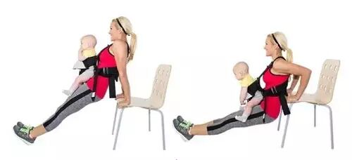 这项动作可以在短时间内塑形手臂!将宝宝放进婴儿背带中(面对或背对您),把双手放在安全的椅子或沙发上,开始屈伸。完成30-45次。