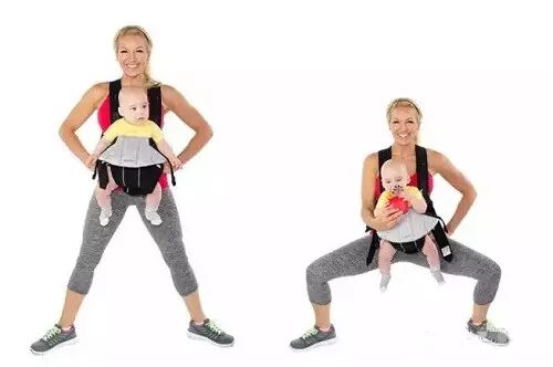 系紧宝宝的婴儿背带,与肩同宽站立,伸展脚趾,开始屈膝。一开始做2组,每组20个。当麻麻变得更有力时,可以加大运动量。