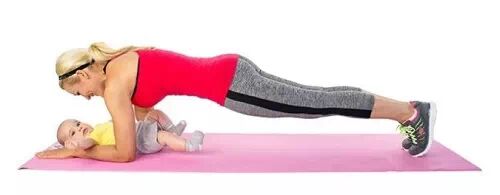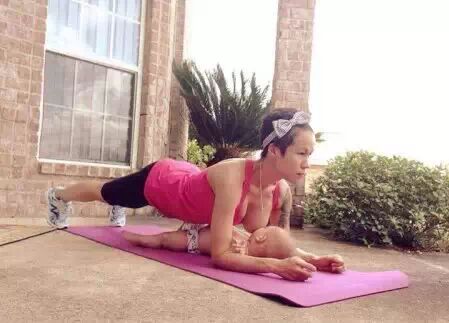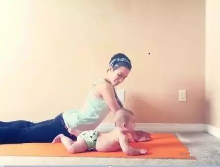 就像做俯卧撑一样,将宝宝放在身下。刚开始做平板支撑时,简直太费劲了。不妨将注意力放在宝宝的微笑上,保持45-60秒。