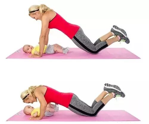 让宝宝仰面躺着,保持俯卧撑姿势。麻麻开始向下做俯卧撑时,一定要给孩子一些甜头!亲吻宝宝,是对麻麻辛勤工作的超棒奖励!完成3组,每组25个。