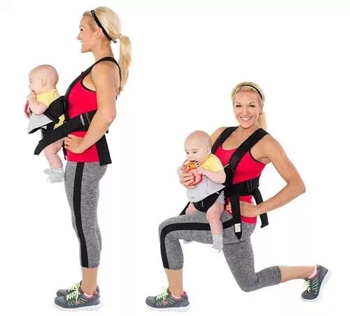 将宝宝放进婴儿背带中(面对或背对您),以90度角弓步向前,稍微转到一边,然后再转回来。完成2组,每组20次。