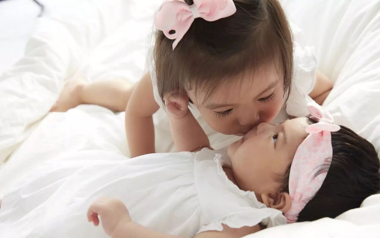 二姐姐布布亲吻小婴儿Bobo,实在太可爱了!好想请贾静雯两口子写写每天看着这么好看的小孩是种什么样的体验..