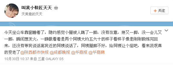 阿姨就说了:阿姨腿脚不好,给阿姨让个座吧!