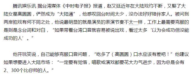 不久前,赵又廷还曾非常虐汪的说:“因吃多了高圆圆的口水,台湾腔没了。”