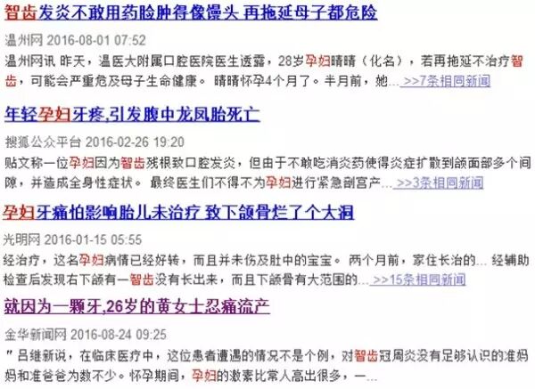 大家都知道,孕龄与智齿冠周炎发生的年龄基本重叠,因此,在口腔门诊中有很多因为智齿发炎而来就诊的孕妇。对于孕期的准妈妈来说,智齿冠周炎真的算是一个“冷血杀手”了。大家看看下面的新闻标题应该就会所感触。