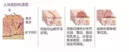 妊娠纹,是由于皮肤的拉伸所造成的疤痕,出现在孕后期。由于荷尔蒙的作用,皮肤和指甲会暗淡,色素沉着。高水平的雌激素会导致蜘蛛状或螺纹状静脉,手掌出现红斑。