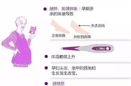 腿抽筋:孕期大腹便便,容易疲劳发生腿抽筋,过量的磷、钙和镁的缺乏以及怀孕期间激素的波动都会导致腿抽筋现象。