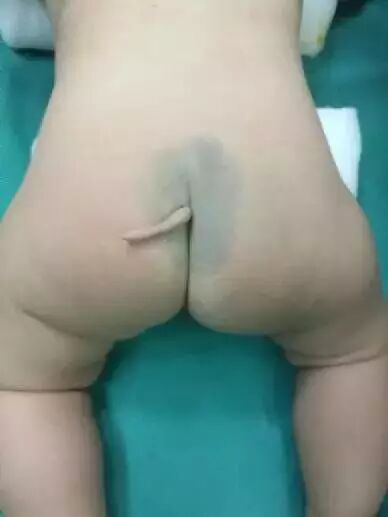 安徽省儿童医院普外二科,收治这名长 “ 尾巴 ” 的五个月大的女婴桃桃(化名),她出生的时候便被发现屁股后拖着一条长约棉签棒,肉红色,柔软无骨,可以弯曲伸直无痛觉,看起来如动物尾巴一般的条形赘生物。医生诊断为:有尾畸形。