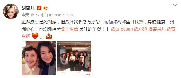 胡杏儿发博称自己和孙俪虽然戏里是死对头,但是戏外敲friend哒