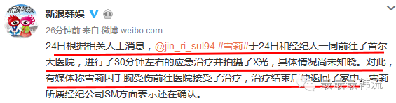 关于雪莉就医的事儿也有媒体表示,她是因为手腕受伤才前往医院的↓
