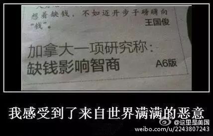 加拿大不列颠哥伦比亚大学研究发现,贫穷与心智间存在关联。经济压力将控制人的思维,缺钱可能使智商和大脑反应速度下降。你兜里钱的多少不仅影响你的生活,还影响你的智商。担忧财政状况消耗人的大脑智商,最多可令人智商下降13点,经济压力会使大脑迟钝。