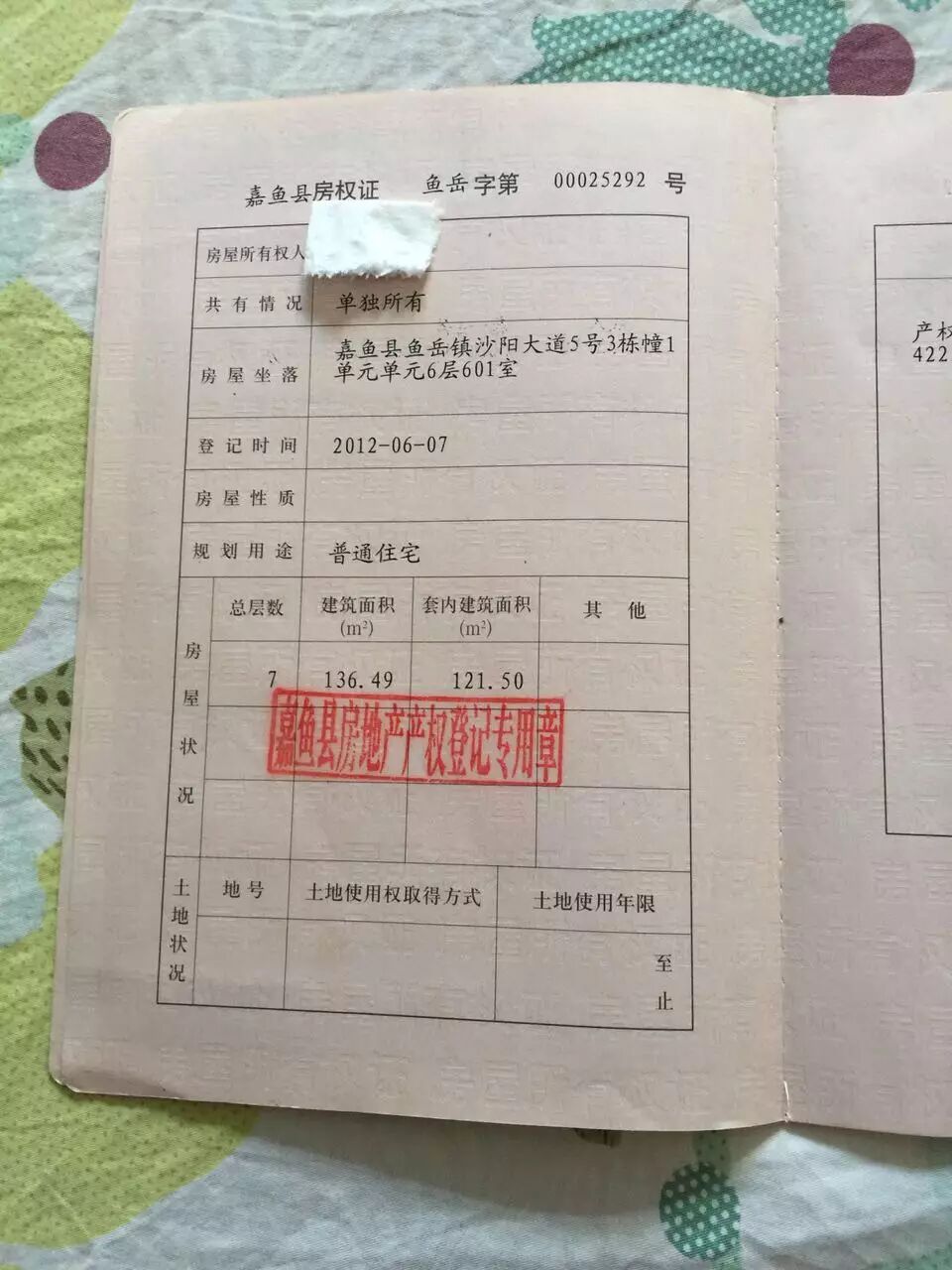 【二手房】区域:嘉鱼县/鱼岳镇,面积:136.49平方,价格:220000元,户型:三室半两厅一卫,描述:新嘉鱼四小院后教师宿舍楼低价出售。楼层:6楼(共7层楼),面积:136.49平米,4室2厅1卫,方向:正坐北朝南(最南边一栋,楼前零遮拦),装修:精装,家具、电器、网络宽带一应俱全,产权:有房产证,特点:学区房,与四小一墙之隔,小孩上学极为方便,无接送之忧,楼方向正坐北朝南,南北通透,通风向阳,宽敞明亮,楼前零遮拦,视野开阔,正南二乔公园方向湖光山色一揽无余。小区环境优美,闹中取静,周边配套齐全,茶庵菜场、永联超市、县实验幼儿园、新四小、中医院、1路公交车站等都在附近,生活极为便利!超低价22万(或看房面议),有意朋友可电话约时看房:18727865915雷老师(温馨提示:此房持有房产证,权益受法律保护,建房土地使用批复文件在原单位保存,个人暂无土地证,待日后统一办理不动产证时由原单位出具土地使用批复文件,如买房朋友一定要房产、土地两证敬请勿扰)(楚山人:18727865915)