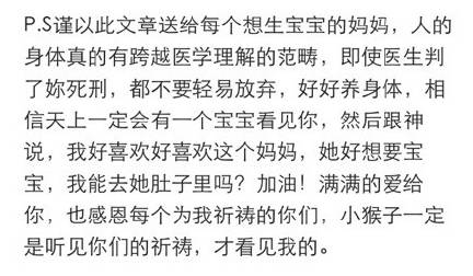 她自己在微博上给大家分享怀孕的秘诀就是:人的身体真的有跨越医学理解的范畴,及时医生判你死刑,都不要轻言放弃,好好养身体相信天上一定会有一个宝宝看见你……