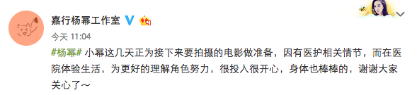 当各大媒体号、营销号开始怒刷“杨幂二胎”的新闻时,今天上午11点04分,杨幂工作室终于澄清是为了之后的电影做准备才去医院体验生活,并没有怀孕。
