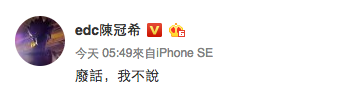 正当大家期待陈冠希给个正面回应时,他发的微博似乎是回应秦舒培已生完的传闻:废话,我不说。倒还挺像他脾气的~